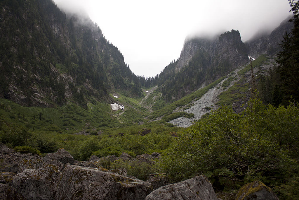 The trailhead to Hanes Valley Trail is located in a residential area of north Vancouver with nearby bus stops from where you can reach the trail. The trail starts by climbing steeply through some forest, and when it levels out after about 15 minutes it passes one of the main viewpoints along the trail. This viewpoint offers views of Vancouver’s downtown, Seymour Mountain and Grouse Mountain. It also offers a good view of Hanes Valley with its surrounding mountains like Mount Fromme, Nancy Greene Lake and others.